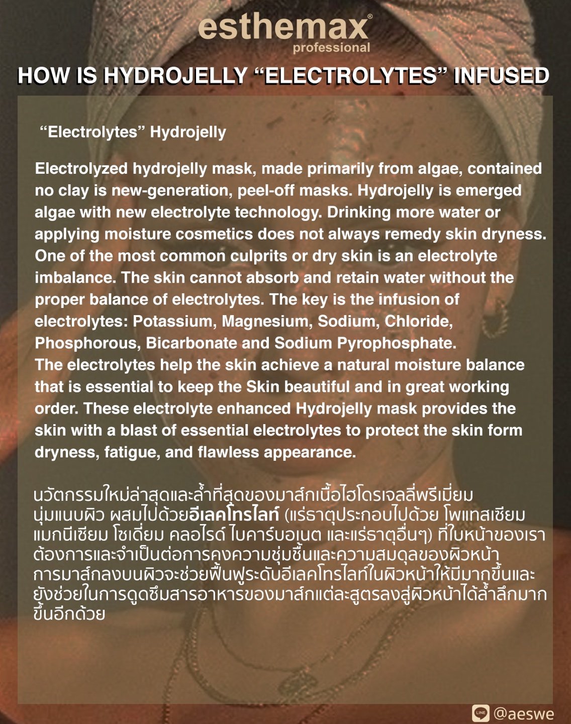 มาสก์ Hydrojelly ™ที่มีอิเล็กโทรไลต์ พูดง่ายๆว่าใช้งัดหน้าให้ผิวดูกระจ่างใส มันคือชุดอุปกรณ์ฉุกเฉินสำหรับผิวหน้าเรานี่แหละค่ะ มาส์ก Hydrojelly ™เป็นมาส์กแบบ "เจลลี่" ที่ให้ประโยชน์หลายประการต่อผิวเช่นการให้ความชุ่มชื้นการทำให้ผิวเรียบเนียนชุ่มชื้น ทำความสะอาดผลัดเซลล์ผิว ปรับสภาพผิวและลดการอักเสบ ที่ใช้ Technology electrolytes นำพาสารอาหารเข้าสู่ผิวแบบทันที และซึมเข้าชั้นผิวได้ลึกกว่า Mask ทั่วๆไป เห็นผลทันทีหลังลอกออก