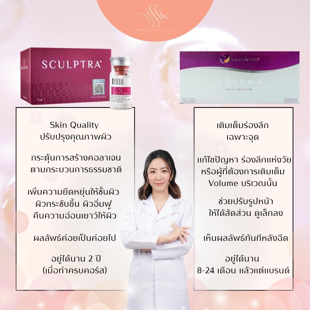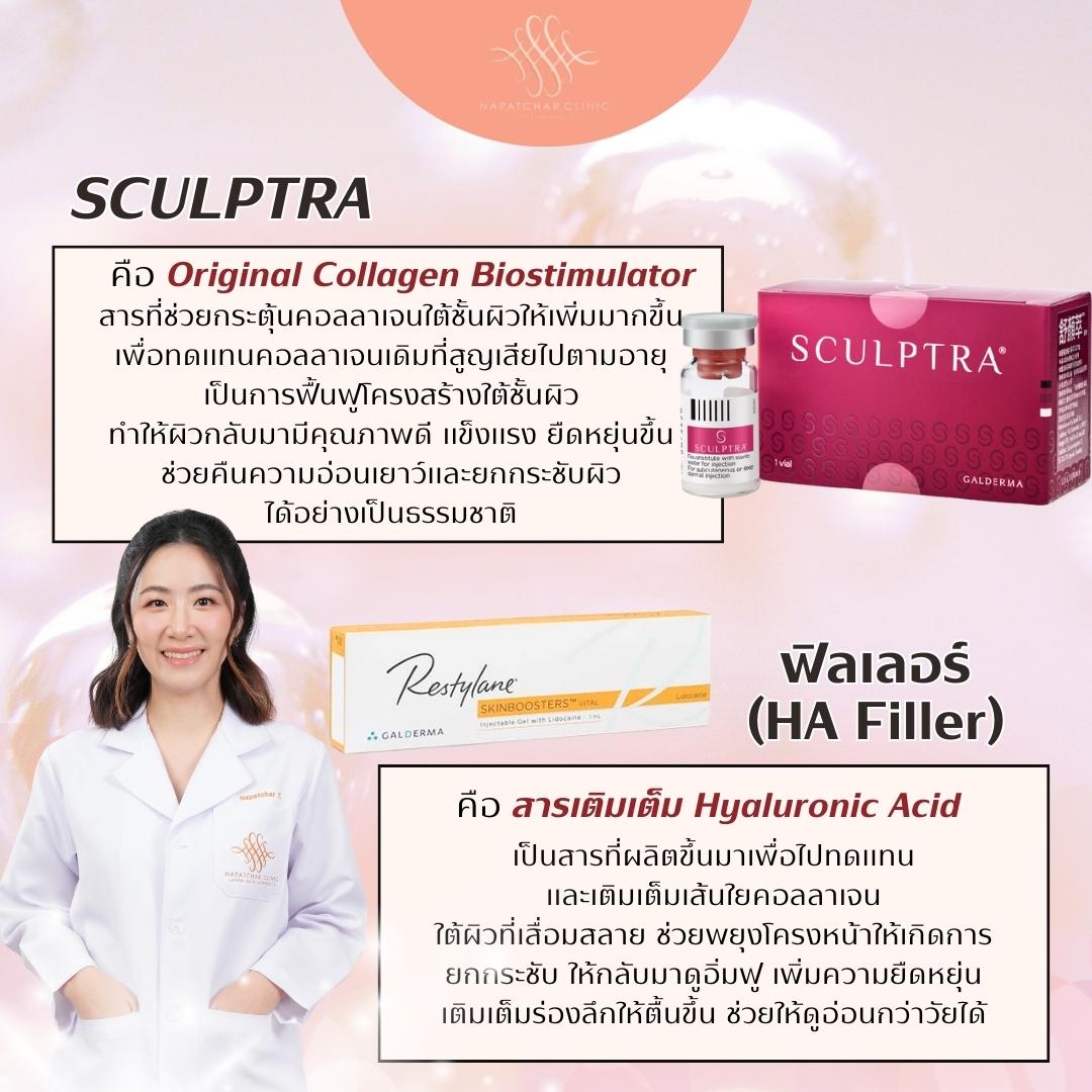 ส่วนตัว Sculptra ลักษณะจะเป็น Solution เป็นสารละลาย ที่สามารถกระจายไปได้ทั่วชั้นผิว เพื่อออกฤทธิ์ที่ชั้นผิวทุกๆบริเวณ ตัวยาจะไปกระตุ้นการสร้างคอลลาเจนจากผิวเราเองอีกที ไม่ได้ไปเติมเต็มส่วนใดส่วนนึงของหน้า แต่จะทำให้ผิวฟูขึ้นทั่วๆ ผิวเฟิร์ม กระชับขึ้น อย่างค่อยเป็นค่อยไปอย่างเป็นธรรมชาติ พร้อมคุณภาพผิวที่ดีขึ้น ผิวที่เด็กลง