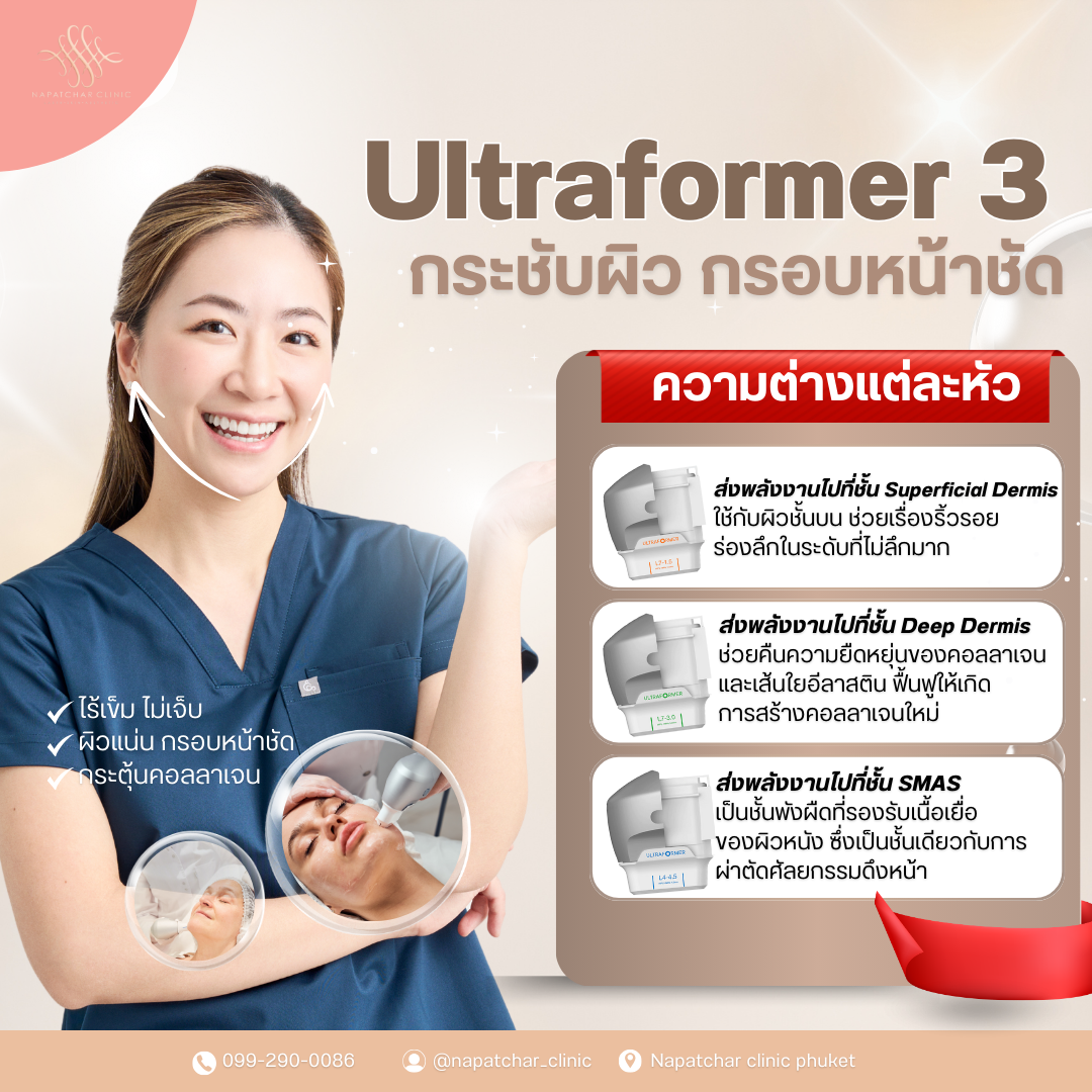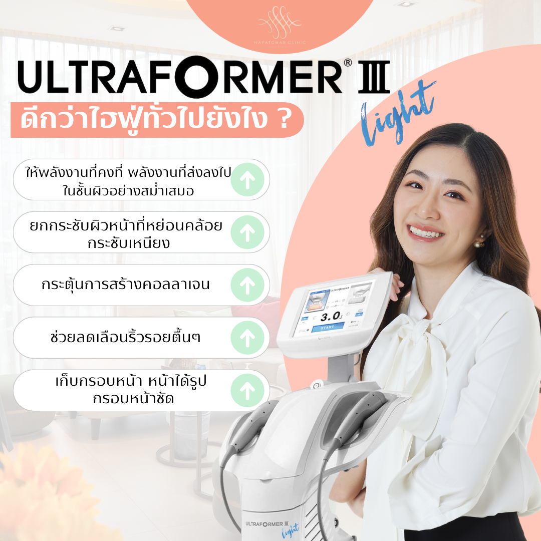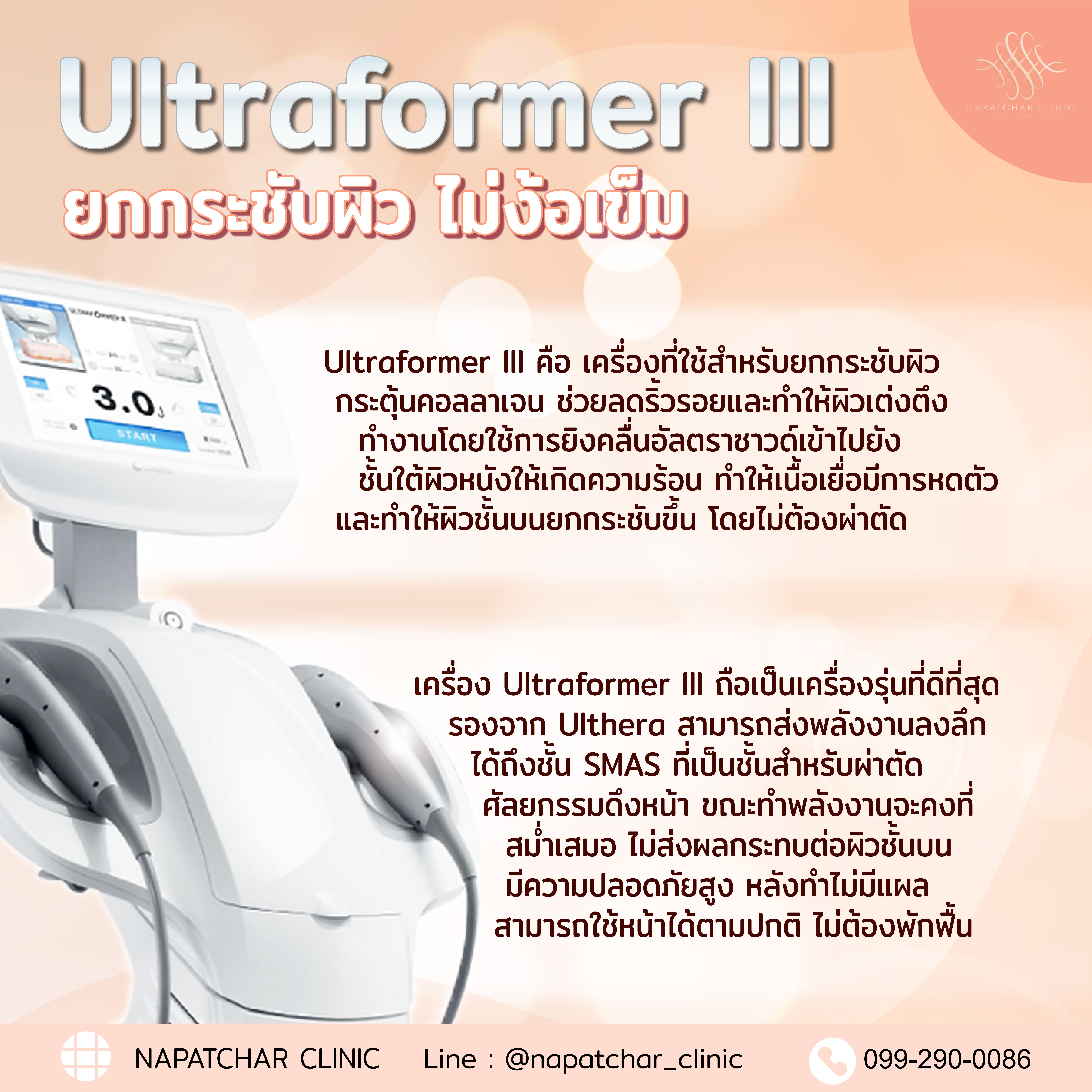 Ultraformer III เทคโนโลยี HIFU (High-Intensity Focused Ultrasound) ในการยกกระชับผิวหน้า เพื่อตอบโจทย์ปัญหาผิวที่หย่อนคล้อย และลดเลือนริ้วรอย ทำให้เนื้อเยื่อมีการหดตัวและทำให้ผิวชั้นบนยกกระชับขึ้น โดยไม่ต้องผ่าตัด เทคโนโลยีนี้ได้รับความนิยมเพิ่มมากขึ้นในวงการความงาม เนื่องจากมีประสิทธิภาพและให้ ผลลัพธ์ที่น่าพอใจ และมีความปลอดภัยสูง