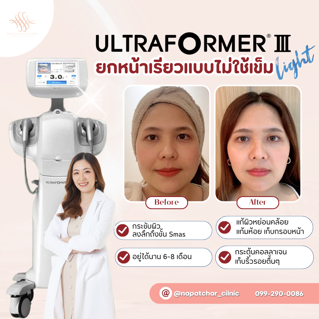 Ultraformer III เป็นนวัตกรรมที่ปลอดภัยและมีประสิทธิภาพในการยกกระชับผิวและลดเลือนริ้วรอย พร้อมกับการฟื้นฟูผิวที่รวดเร็วและไม่ต้องใช้เวลาในการพักฟื้นมากนัก หากคุณสนใจการรักษาด้วย Ultraformer III ควรปรึกษาผู้เชี่ยวชาญเพื่อวางแผนการรักษาที่เหมาะสมกับสภาพผิวของคุณ และเตรียมพร้อมที่จะก้าวสู่ การมีผิวที่กระชับและอ่อนเยาว์ ยิ่งขึ้นค่ะ